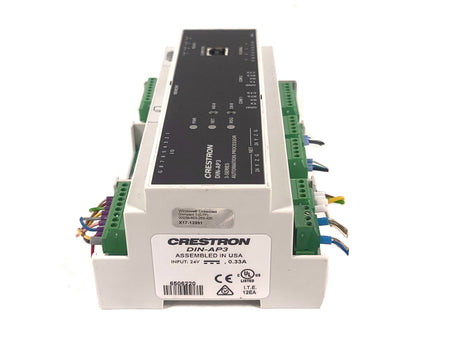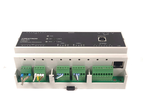 The Crestron DIN-AP3 is an automation processor module designed as the central control brain for small to medium-sized smart building and room automation systems. As part of Crestron's 3-Series platform, it provides the core processing power and logic to manage and integrate various subsystems within a unified environment, such as corporate boardrooms, classrooms, executive offices, and hospitality suites. The processor executes programmed control logic, responding to user inputs from touch panels, keypads, or sensors to automate sequences like lowering motorized window shades, adjusting lighting scenes, starting videoconferences, and managing AV equipment power and routing. Its modular DIN-rail mountable form factor allows for neat and secure installation within electrical enclosures or equipment racks, facilitating organized system builds alongside other low-voltage components.