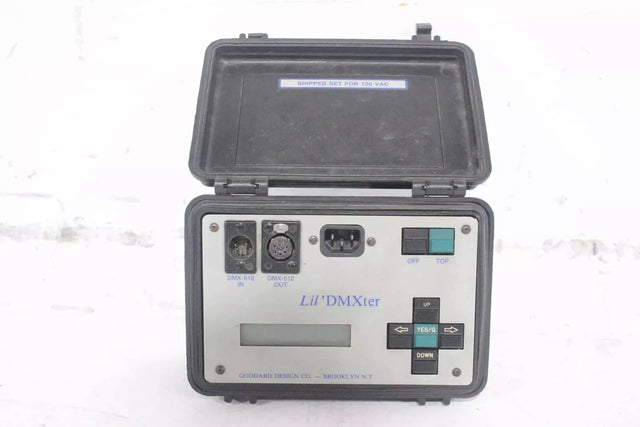 The Lil' DMXter is a compact, handheld diagnostic tool crucial for lighting technicians, stage managers, and installers working with DMX-controlled lighting systems. It allows users to monitor DMX data streams, test cables, send test signals to lights, and verify the integrity of the entire lighting network. The device is straightforward to use and provides essential real-time feedback on DMX parameters. This specific offering includes a robust, custom-fitted hard case with a locking mechanism, ensuring the delicate test equipment is protected during transport and storage across various production environments. The overall solution is a reliable kit for field diagnostics in theatrical productions, concert tours, or architectural lighting installations.