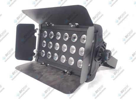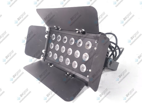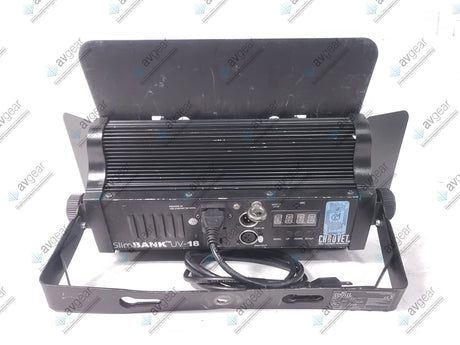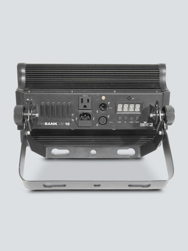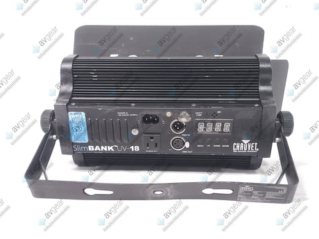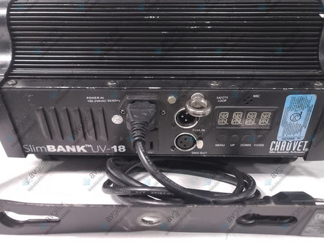 The Chauvet UV-18 Slim Bank is a high-powered LED blacklight featuring 18 UV LEDs, designed for striking ultraviolet effects in various settings such as entertainment venues and parties. It operates with a wavelength range of 400-410 nm, delivering vivid blacklight illumination. The fixture offers a wide 65° beam angle and strobe rates up to 20Hz for dynamic lighting effects. It supports power linking of up to 22 units, enabling scalable setups for larger areas. The unit is built with a rugged housing and provides easy control with DMX compatibility and a straightforward interface.