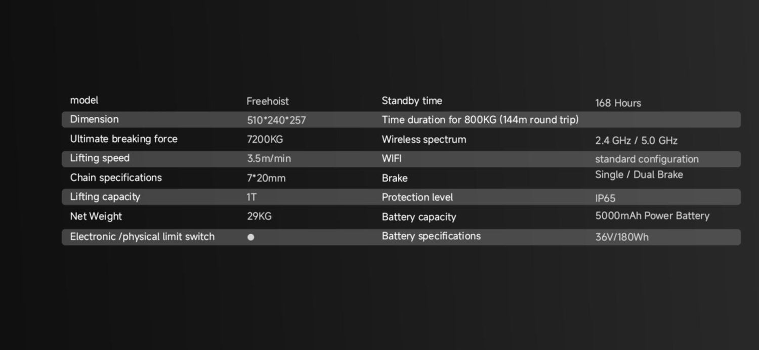 Package Includes: Main Hoist Unit: 1, Chain: 65.6 feet (20 meters), Chain Bag: 1, Charger: 1, Battery: 1, ATA Case