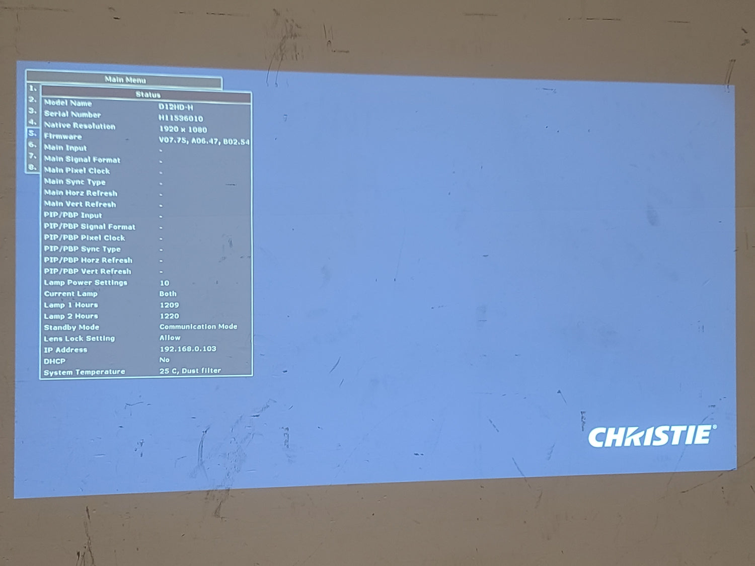TheChristie D12HD-H has lamp usage of 1209 hours on Lamp 1 and 1220 hours on Lamp 2. These hours indicate significant use, approaching the typical lifespan of the lamps. It offers 10,000 ANSI lumens brightness and HD resolution, does not include a lens, and comes in a wheeled road case.