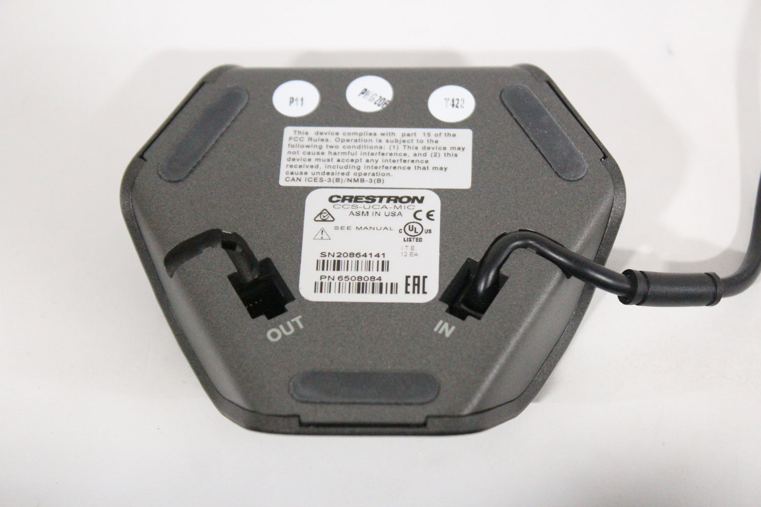 The CCS-UCA-MIC is a low-profile extension microphone pod designed exclusively for use with a Crestron Flex Tabletop Conference System.1 Up to two mic pods may be connected to a single conference device to extend its pickup range to cover large tables.