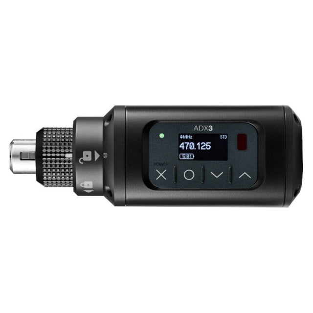 The Shure AD3 is a digital handheld wireless plug-on microphone transmitter compatible with Axient Digital series receivers. The AD3 features a secure XLR connector and supplies 48 V phantom power, allowing you to use any handheld or shotgun XLR microphone with the Axient digital wireless system.