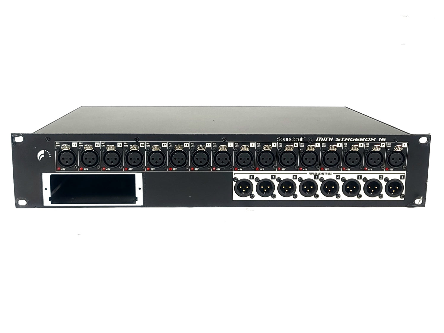 The Mini Stagebox 16R (2U) model providing 16 analogue inputs and 8 line outputs making a 16 x 8 matrix. It connects to any of the Soundcraft Si Expression, Si Compact, Si Performer, Si Series and Vi Series consoles via a MADI card fitted to the option card slot.