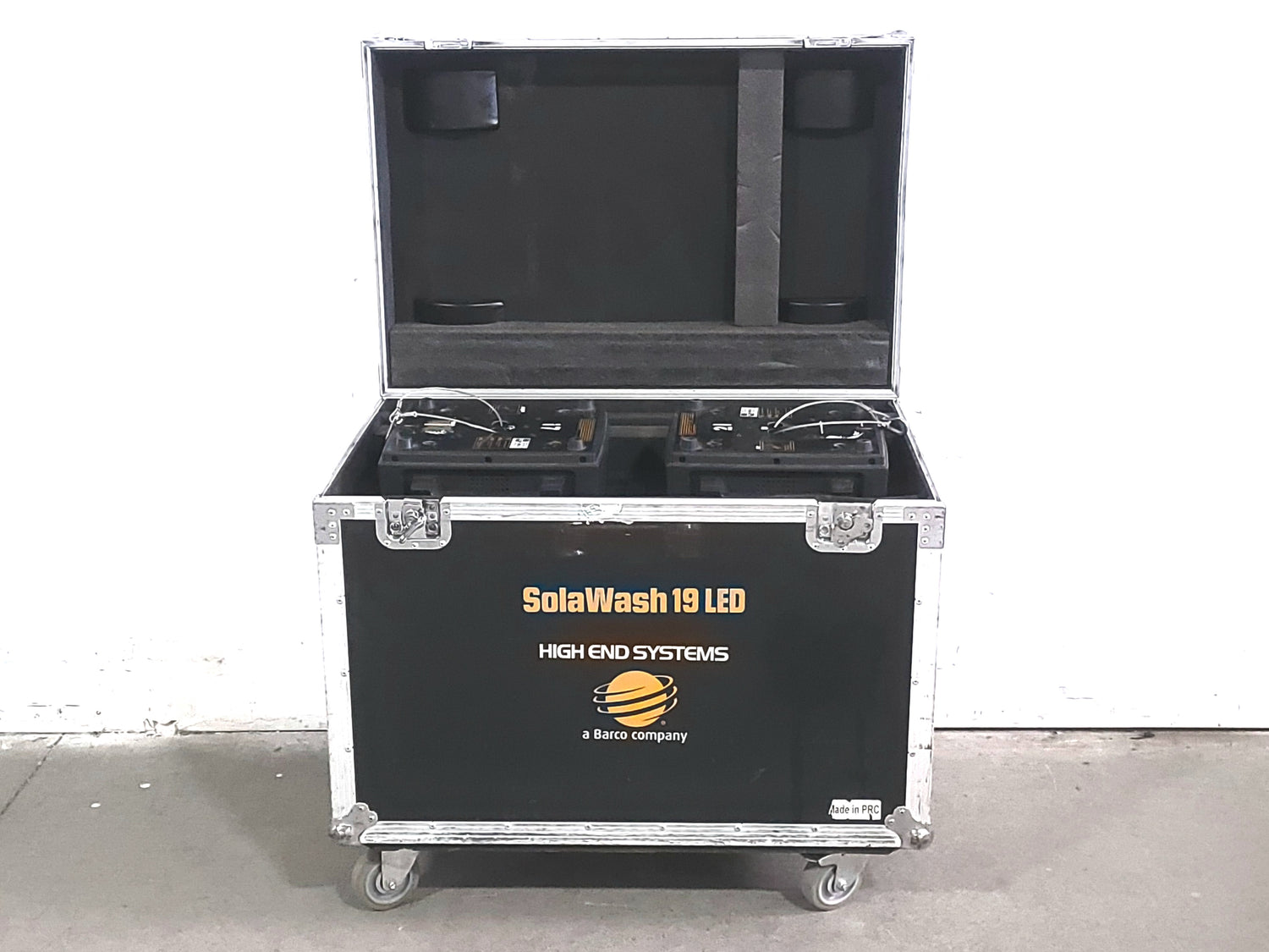 (2) High End Systems Solawash 19 LED Moving Head Light w/ (4) Mounting Brackets, (2) PSU Cables & (2) Safety Cables in Wheeled Hard Case
