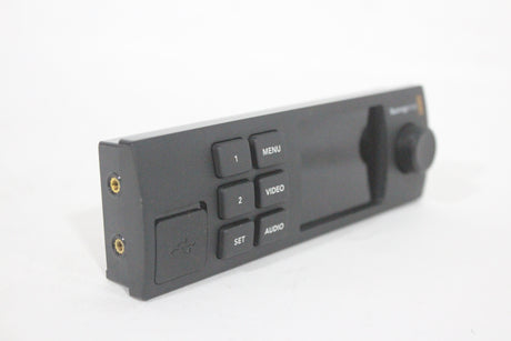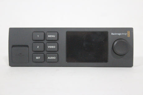 The Blackmagic Design Teranex Mini Smart Panel is an optional front panel accessory for Teranex Mini converters and the Blackmagic Web Presenter. It replaces the standard front panel, adding a 2.2-inch color LCD screen, a spin dial, and six buttons for enhanced control and monitoring. This allows users to adjust settings, navigate menus, monitor video and audio levels, verify timecode, and confirm the video standard being converted.