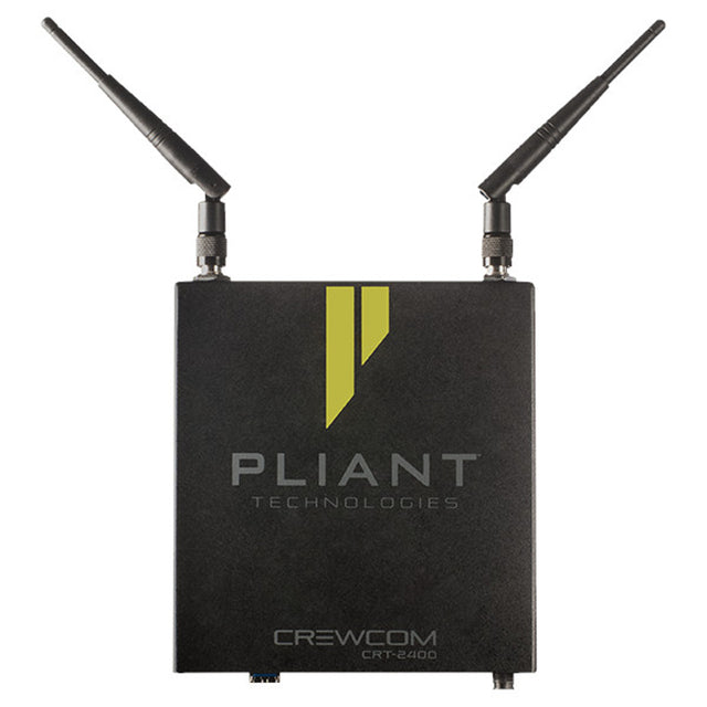The Pliant CRT-2400 is a 2.4 GHz radio transceiver designed to function as an access point for the Pliant CrewCom wireless intercom system. It establishes RF communication with CrewCom radio packs, extending wireless coverage for professional productions in demanding environments like broadcast, live events, and theater.