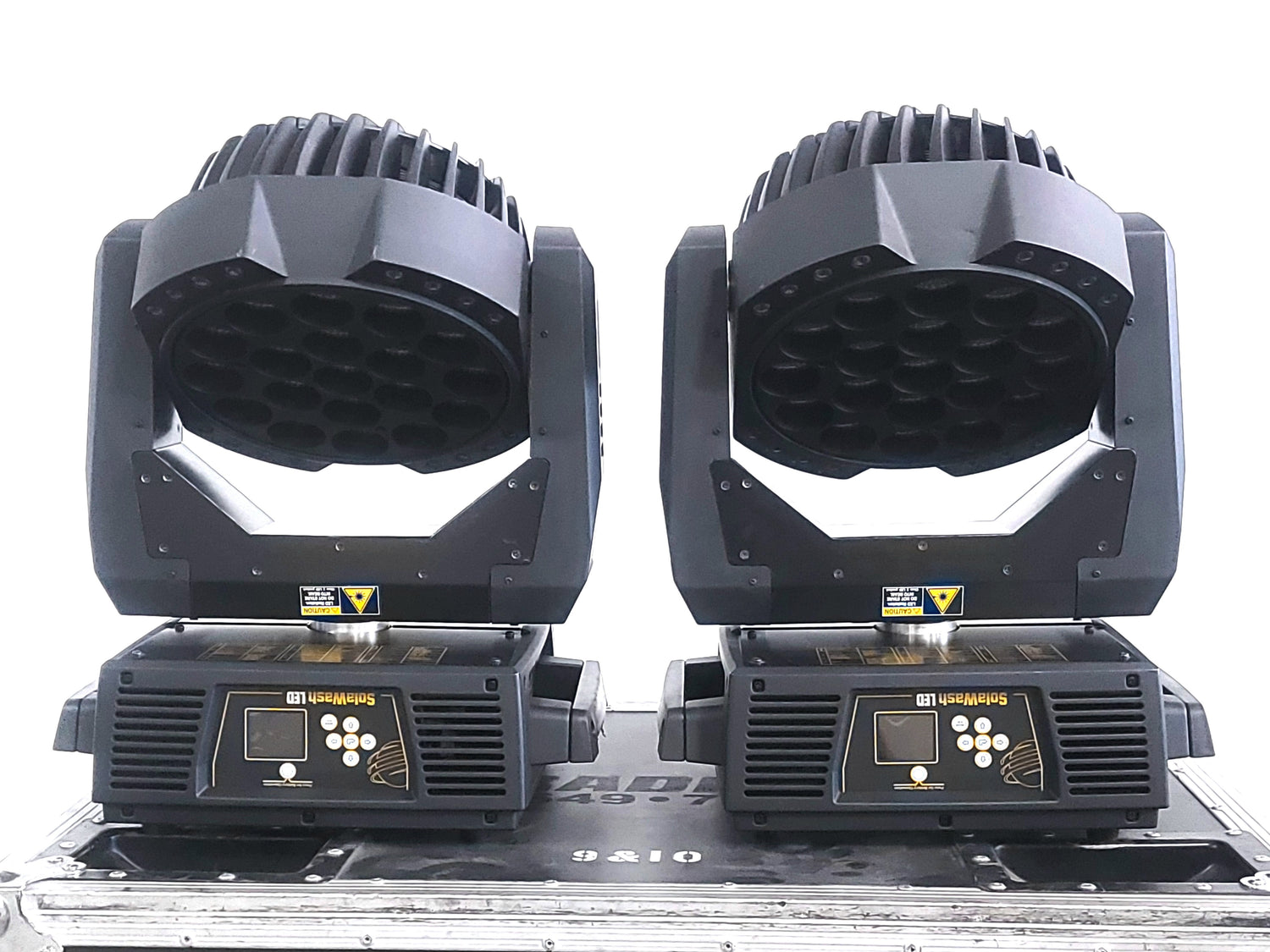 (2) High End Systems Solawash 19 LED Moving Head Light w/ (4) Mounting Brackets, (2) PSU Cables & (2) Safety Cables in Wheeled Hard Case