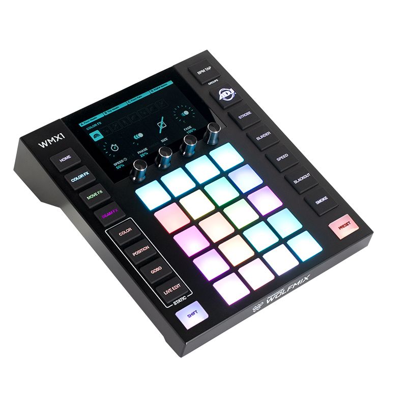The ADJ Lighting WMX1, powered by Wolfmix, is a standalone lighting control system designed with the performer in mind. Featuring a 4.3” color touchscreen display and 37 backlit silicone buttons, it allows intuitive hands-on control of a DMX lighting setup. It features a toolbox of FX modules and eight independent fixture groups which allow for the simple creation of high-impact light shows on the fly without a computer. Ideal for mobile entertainers as well as bars, clubs, and entertainment venues, this compact but powerful controller puts creative lighting control at any user’s fingertips.