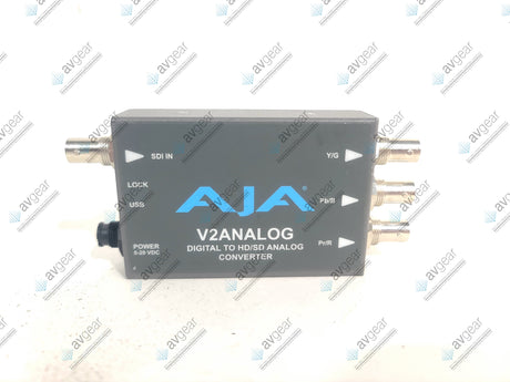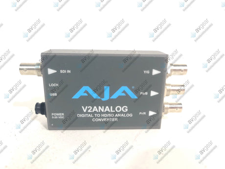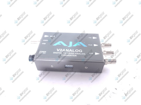 The AJA V2Analog HD/SD-SDI to Analog Mini-Converter is an essential tool for broadcast, post-production, and professional AV installations that need to bridge the gap between legacy analog gear (like monitors and VTRs) and modern HD/SD-SDI environments. This compact, low-power device accepts incoming HD/SD-SDI digital signals and converts them to various analog outputs, including component (YPbPr, Betacam, RGB) and composite (NTSC/PAL or S-Video) formats. This versatility allows for seamless integration into diverse workflows without the need for expensive equipment overhauls.