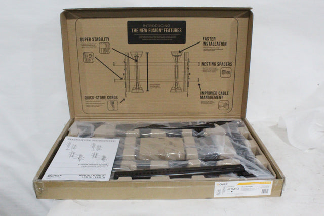 The Chief MTM1U Fusion Series Tilting Landscape Wall Mount will support TVs and monitors 26 to 47" and up to 125 lb, displayed in landscape mode. It offers the option of post-installation lateral shift up to 12.9" and height and level adjustment. It features a built-in cable stand for easy access under the screen. The MTM1U has ClickConnect, which provides an audible click when the screen is safely engaged with the mount.