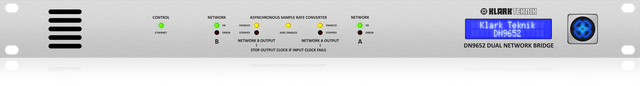 The Klark Teknik DN9652 Digital Audio Network Bridge provides a multichannel interface between two 3rd-party digital audio networks and point-to-point interfaces. The 3rd-party interfaces operate in separate clock domains and are connected by a bidirectional asynchronous sample rate converter (ASRC). This technology allows the interfacing of up to 64 bidirectional channels between two independently clocked domains, which can also operate at different sampler rates.