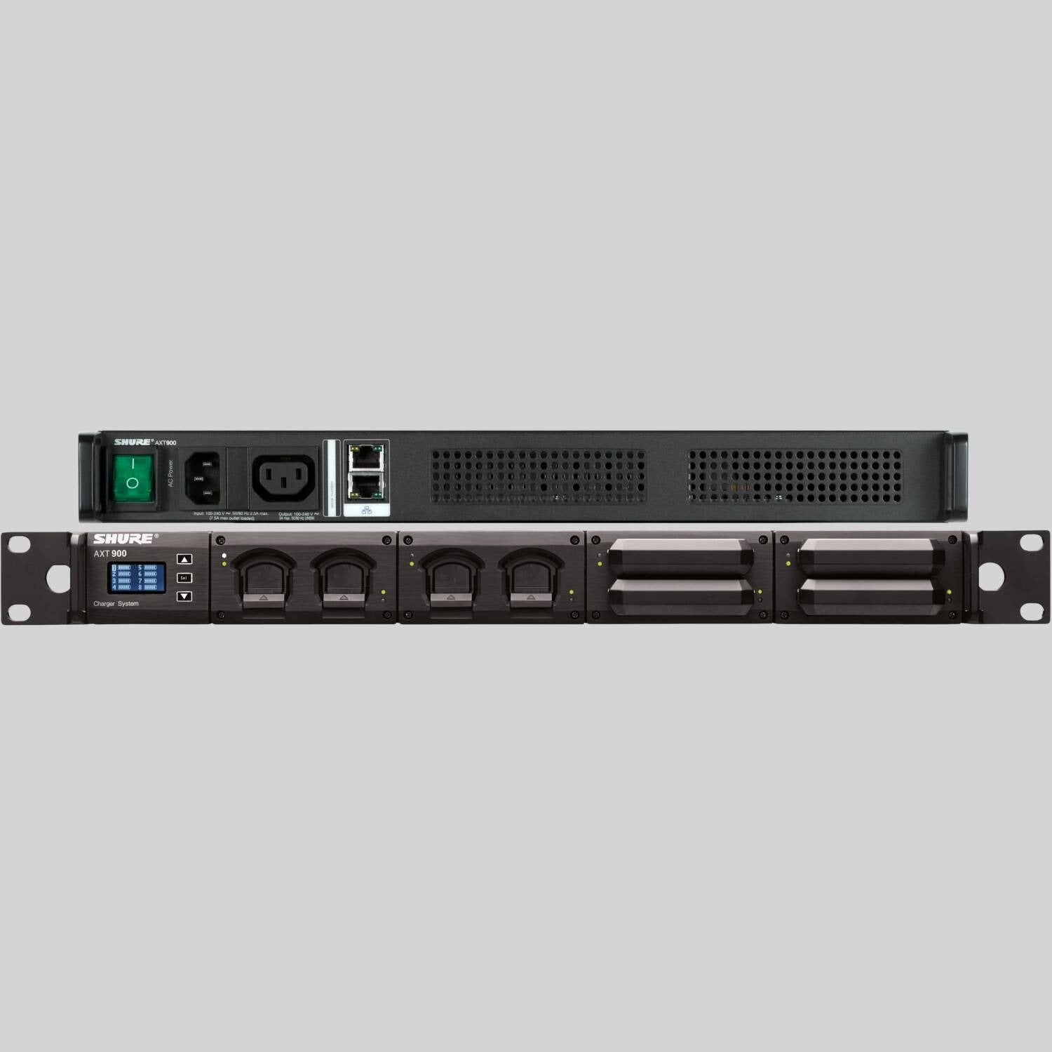 The Shure AXT900 Rackmount Charging Station provides a touring-ready battery charging and storage solution with networked visibility of all battery status parameters.