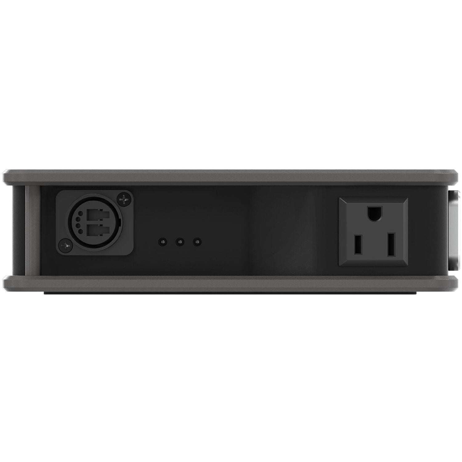 The unit features an integrated power supply with a locking powerCON input connector and a built-in standard AC outlet to power a nearby projector, TV, or laptop. There is also a loop-through Edison NEMA 5-15 output to daisy-chain your modules or power a compatible device.